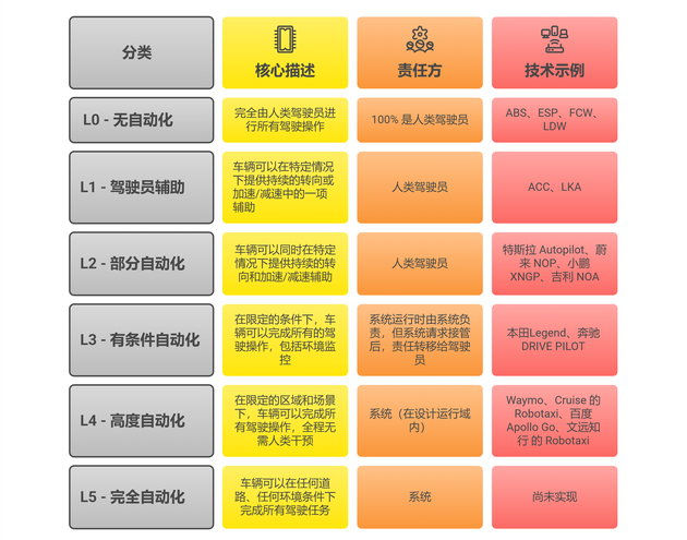 按国际汽车工程师学会(SAE International)制定的SAE J3016标准,自动驾驶分为6个等级,分别是L0、L1、L2、L3、L4、L5,其中L0全部由人类驾驶,系统只是特定场景下提供辅助,比如ABS、ESP等,而L3是有条件自动化,即条件满足时交由系统控制,条件不满足时立即移交人类接管。
