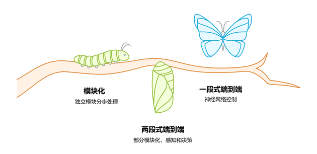 这个阶段,自动驾驶分拆为独立模块,分步处理,即感知→预测→决策→规划→控制,各个模块通过人工定义的接口来传递数据。优点:模块独立开发,便于调试和功能迭代;缺点:场景碎片化、无法处理未预编程的极端场景。