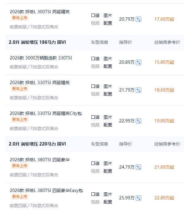 价格方面,2026款探岳300TSI两驱车型起售价20.79万,探岳L 300TSI两驱精英版起售价21.79万,整体定价与老款基本持平。从终端优惠来看,目前部分地区存在一定幅度的降价,实际入门价可低至17.69万起。同时品牌推出限时购车政策,包括City包及380车型至高享商业险免单,精英版车型可享进阶版超值装备。