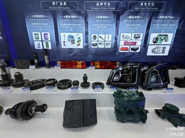 本次展会,一汽解放主要展览后市场备品服务中的车辆养护、车辆维修、事故理赔三大场景业务产品以及再制造产品和精品文创产品。