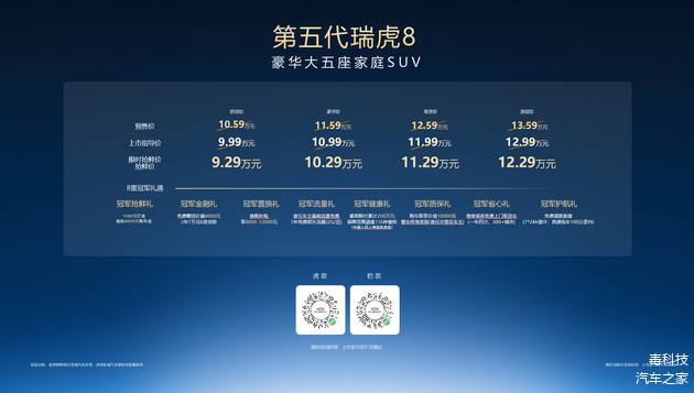 为回馈消费者,第五代瑞虎8这次推出了8重冠军礼遇。最关键的是:限时抢鲜价只要 9.29 万元起!此次青岛区域的成功上市,再次印证了其卓越的产品实力。未来,第五代瑞虎8将持续以冠军之姿,陪伴更多用户开启精彩出行生活。想买大五座SUV的,这车绝对值得去店里摸一摸,试一试!
