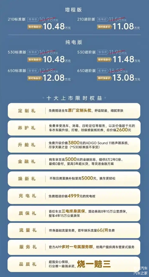 首先,在AION i60给出的限时权益当中,厂家提供了“烧一赔三”的品质礼,也算是帮助消费者减轻了对于新能源车的痛点。除此之外,其中还包含了免费赠送4999元的充电桩,以及免费升级价值3800元的音响系统等等。