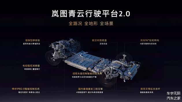 整车基于800V岚海智能超混平台打造,采用1.5T插混方案,CLTC工况下有着370km的纯电续航与1400km的综合续航。整车支持5C超充技术,可在12分钟内完成80%的电量补充,充电10分钟即可增加450km续航。整车底盘部分采用双叉臂+多连杆的全铝结构,并配备三腔空气悬架与CDC可变阻尼减振器,兼顾了操控精准性与乘坐舒适性。