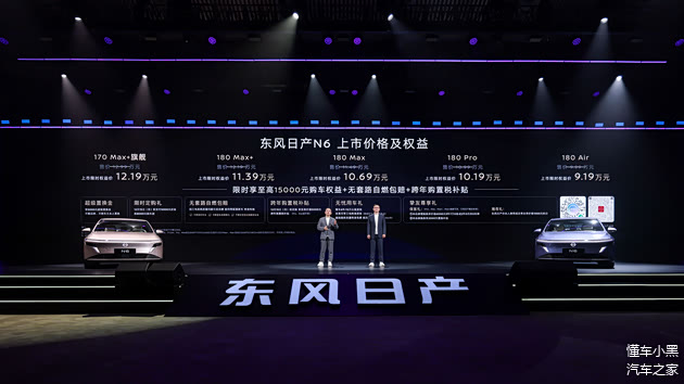 12月1日,以“NI好,插混新势力”为主题的东风日产N6上市发布会在广州举行。东风日产天演架构下的首款插混车型——东风日产N6正式上市。新车定位“大电池超舒适中高级插混轿车”,凭借王牌产品硬实力、越级智能软实力、央企合资高品质三大核心优势,重新定义插混轿车新标准。此次,东风日产N6推出了180Air、180Pro、180Max、180Max+、170Max+旗舰共5个版本,售价区间为9.99-12.99万元。