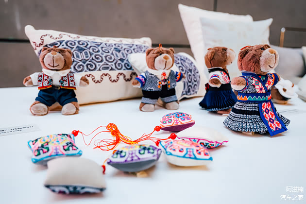 唐三彩非遗传承人与清美教授从国产“新世代”车型的大圆柱电池中汲取灵感,创造出名为“流光”的移动能源艺术品。设计师摒弃了传统充电宝千篇一律的塑料或金属冷感,邀请唐三彩非遗匠人手工调制釉色,经过高温烧制,让用户手中每一个充电宝都拥有独一无二的彩色陶瓷外壳,量产的工业产品同时拥有了手工艺产品的“量身订制”特性。来自云南大山里的苗绣非遗传承人,与清美教授合作设计,开发了“织梦驭绣”非遗文创品系列,覆盖服饰、家居、车载、配饰、玩偶多品类,以苗绣、蜡染及苗族服饰的复原与提取为核心设计逻辑,打造苗绣BAVA熊专属IP。来自德国巴伐利亚的BAVA熊,身着融合宝马“双肾格栅”设计元素的苗绣服饰,以萌趣形象承载民族技艺,成为文化交流、联结传统与潮流的文化使者……