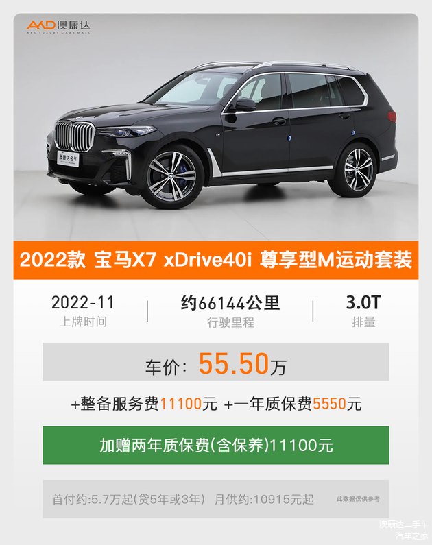 澳康达在售这台2022款 宝马X7 xDrive40i 尊享型M运动套装,行驶了约6.6万公里,售价仅需55.5万,如果您更看重科技感、操控性能和家庭实用性,它的现代科技配置和灵活空间布局,既能满足您的驾驶乐趣,也能照顾到家人的乘坐舒适。