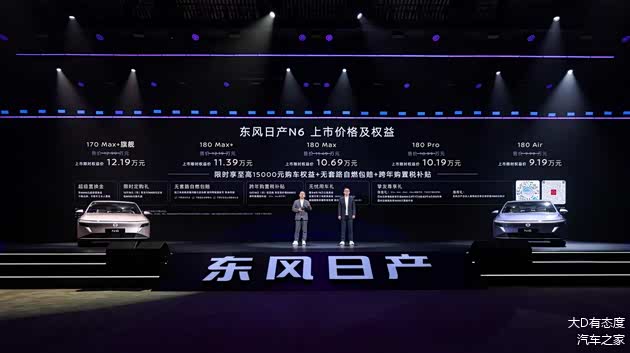 12 月 1 日,东风日产以 “NI 好,插混新势力” 为主题,于广州正式举办 N6 上市发布会。作为东风日产天演架构下首款插混轿车,N6 重磅登场。新车定位 “大电池超舒适中高级插混轿车”,凭借王牌产品硬实力、越级智能软实力、央企合资高品质三大核心竞争力,重新树立插混轿车市场新标准。本次上市的东风日产 N6 共推出 180Air、180Pro、180Max、180Max+、170Max + 旗舰版五款车型,官方指导价区间为 9.99 万 - 12.99 万元。