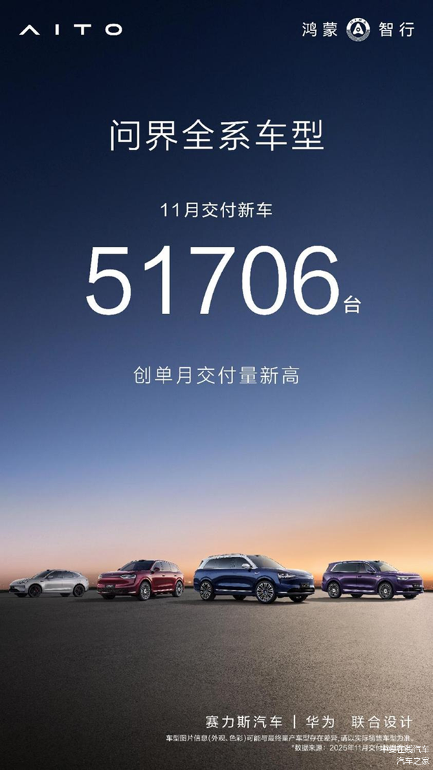 12 月 2 日,问界汽车最新月度交付数据出炉,全系车型11月交付量超5万辆,一举刷新品牌单月交付纪录。截至目前,问界全系累计交付量突破 90 万辆,充分展现出品牌在高端智能新能源汽车赛道上的强劲势头。