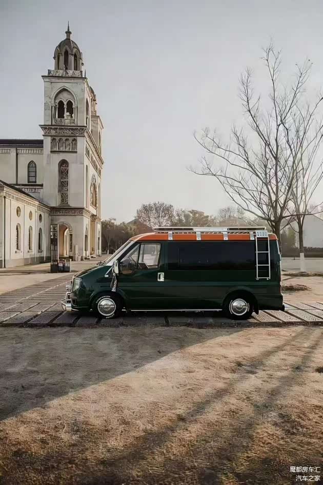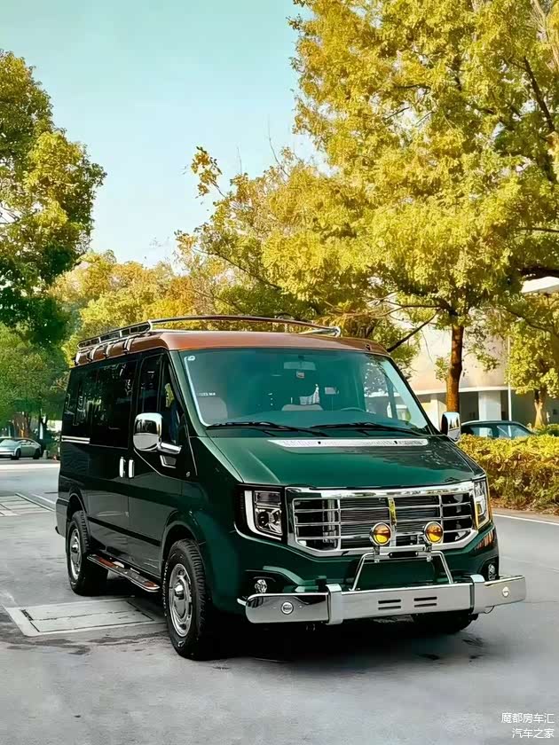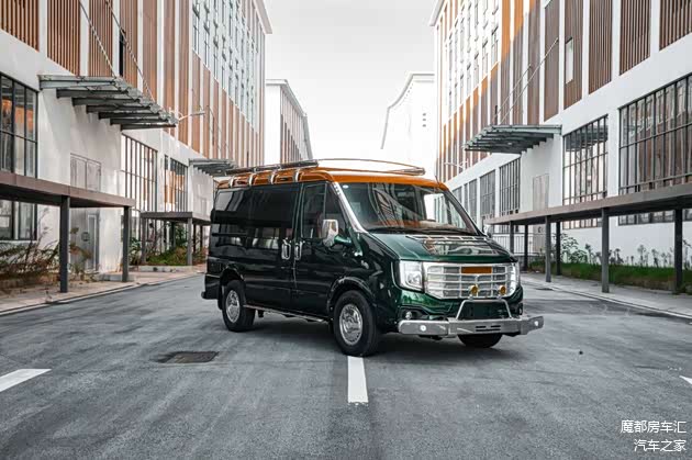 外观方面:外观是这款车的非常一大亮点。整车以墨绿色为主色调搭配,车顶呢采用棕色调拼接,配上独家开发的银色的前后护杠、车顶平台和侧爬梯,看起来有点像复古风格的越野车,在这么多的设计的宿营车中显得非常有辨识度,也是这台车可以爆火的一个原因。
