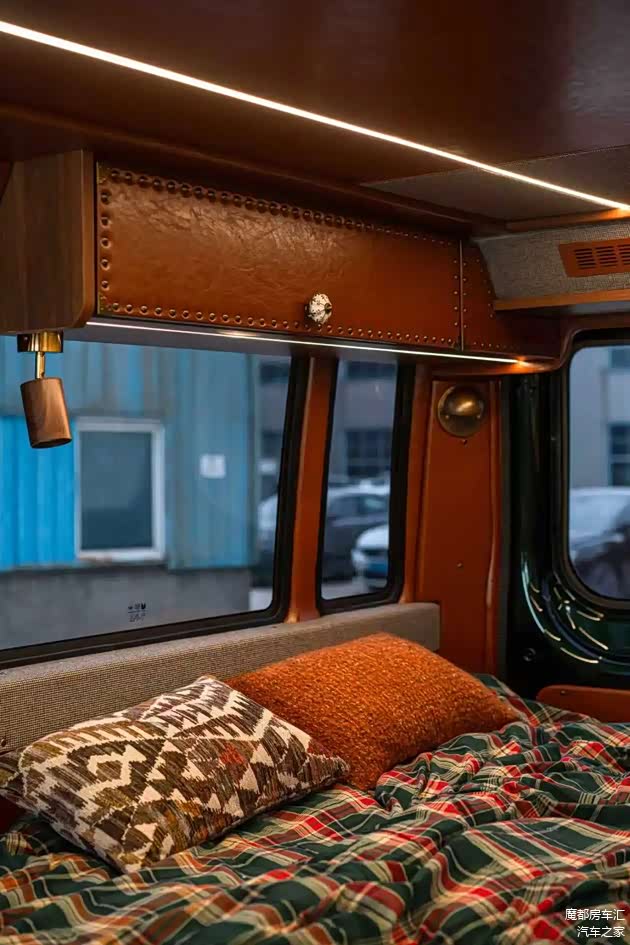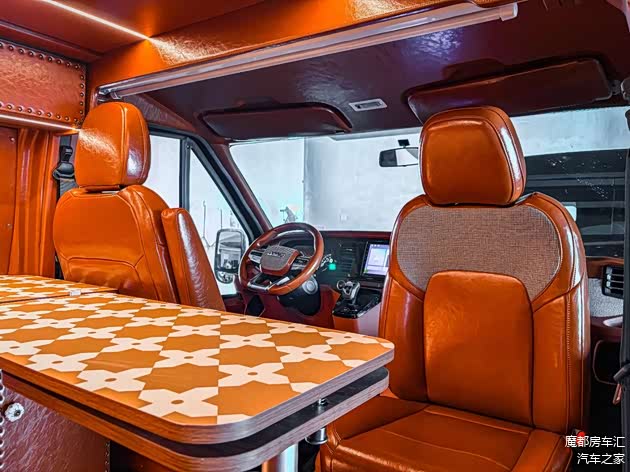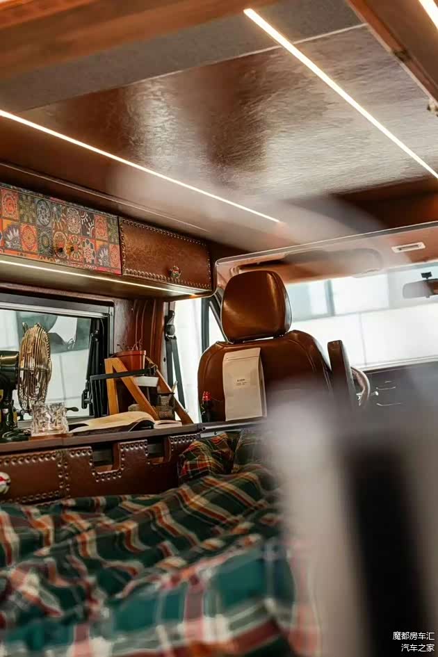 内饰方面:车内延续了外观的复古款式,座椅和门板都用复古的油蜡皮包覆,地板是美式复古印花款式,顶棚采用麂皮的材质。储物空间设计周到,车顶安装有吊柜,左侧是高柜,右侧是多功能的魔盒。