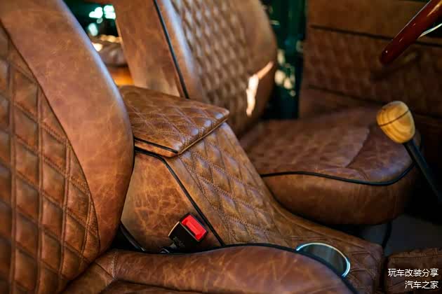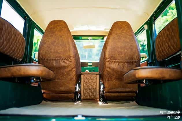 内饰是这次重制的点睛之笔,虽然整体布局沿用原本的设计,但所有用料和配色都采用了全新的配方,栗色全粒面真皮包裹成为车厢主调,包括全新的前排座椅,还有重新包裹的车门面板、后排长椅、手刹防尘套、挡把防尘套和新增的中控扶手箱等。配置还新增了空调系统、四扬声器音响、木质方向盘和全新地毯,整体搭配保留了复古气息但丝毫不觉得陈旧和古老,相反还显得十分精致。