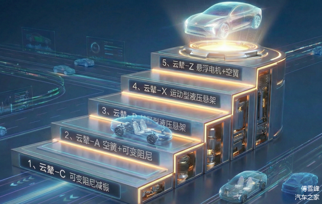 云辇-C(可变阻尼减振器)、云辇-A(空簧+可变阻尼减振)、云辇-P(越野型液压悬架)、云辇-X(运动型液压悬架)、云辇-Z(悬浮电机+空簧)。