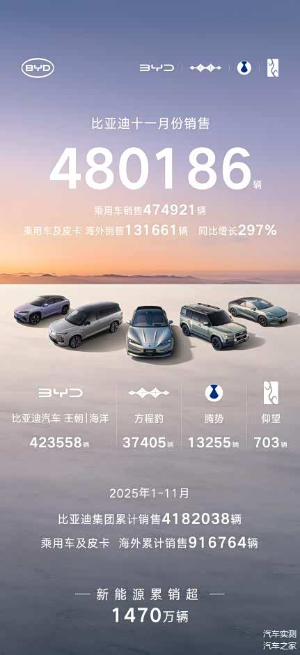 凭借产品矩阵和销售体系,比亚迪在2025年11月交出了一份亮眼的成绩单。公司当月实现新能源汽车销量480,186辆,这一数字不仅是2025年内的单月最高纪录,也进一步巩固了其在全球新能源汽车市场的领先地位。