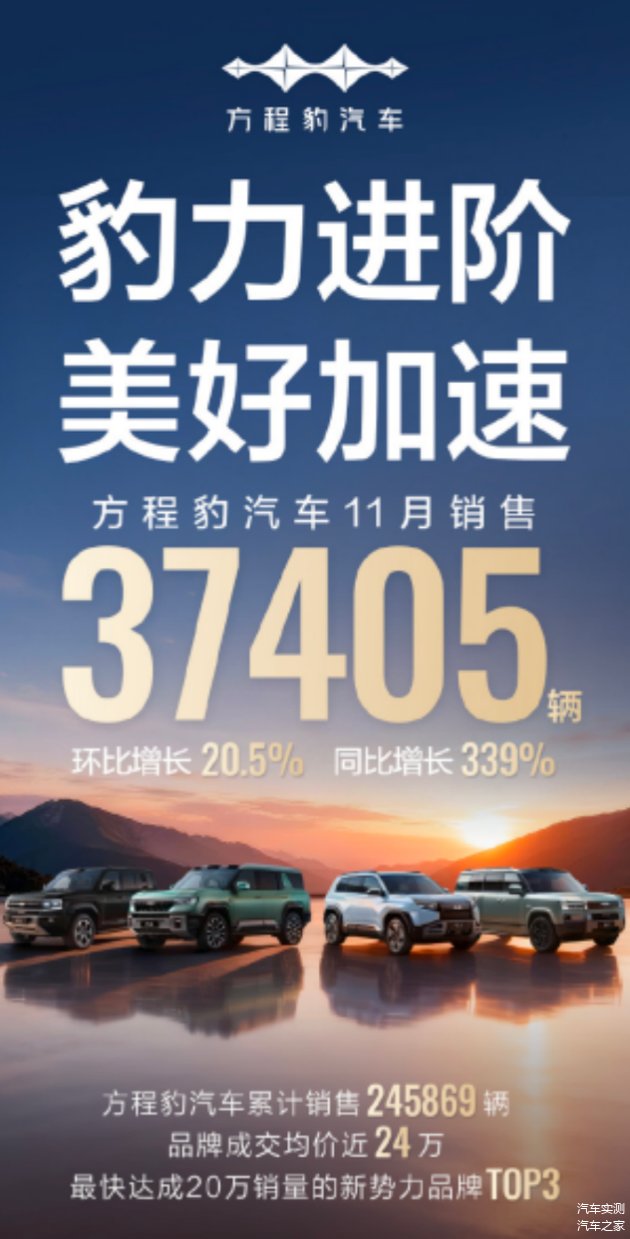 其中,方程豹品牌表现最为抢眼。11月销量达37,405辆,环比增长20.5%,同比激增339%。截至目前,该品牌累计销量已突破24万辆,成交均价接近24万元。