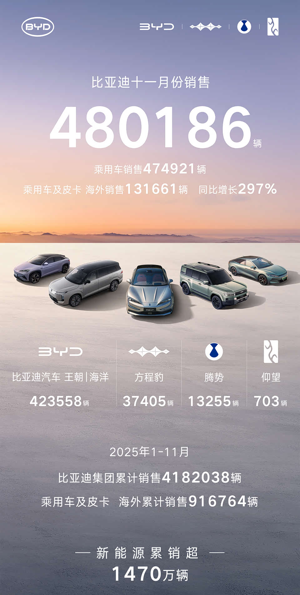 从官方数据得知,比亚迪在今年11月的单月销量高达480186辆。其中,作为比亚迪业绩基盘的王朝、海洋系列车型,直接交出了423558辆的答卷,稳住了业绩基础。而得益于钛7、腾势N8L等冲量新品的发力,方程豹、腾势分别以37405辆、13255辆的好成绩收官,同时仰望以703辆的成绩持续领跑自主豪车市场,整体呈现出稳中求进的业绩态势。