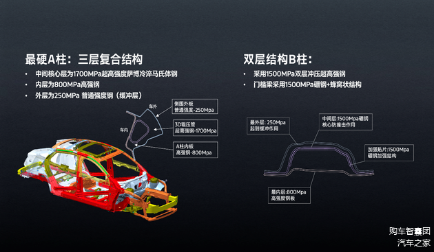 安全性上,福特新蒙迪欧采用超强笼式车身,车身结构全面强化,600MPa以上高强度钢占比提升至53%;A柱采用1700MPa超高强度萨博冷淬马氏体钢三层复合结构,搭配B柱1500MPa双层冲压超高强钢,协同提升抗变形能力,进一步强化车身整体刚性。