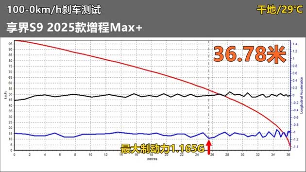 测试刚一开始,享界S9 2025款增程Max+就展现出超出预期的稳定性,5次测试中最短刹车距离仅为36.78米——这个成绩不仅在中大型轿车中处于上游水平,更足以媲美部分运动型轿车,彻底颠覆了人们对舒适取向车型的性能偏见。