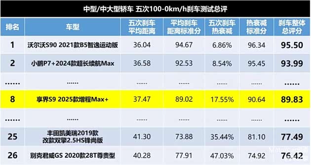 综合各项数据,享界S9 2025款增程Max+最终的刹车总评分为89.83分,在我们测试过的所有中型及中大型轿车中排名第八。