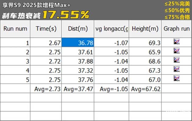 连续制动的稳定性,同样是衡量刹车系统性能的关键指标。在5次连续测试中,享界S9 2025款增程Max+的刹车成绩并未出现大幅波动,5次平均成绩为37.47米,计算得出的刹车热衰减率仅为17.55%。