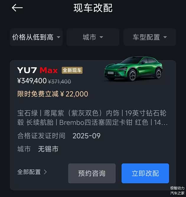 小米YU7作为2025年6月26日推出的首款豪华高性能纯电SUV,上市初期市场反响热烈,开售1小时大定即突破28.9万台。此次现车选购中,YU7 Max版本最高可享受限时免费立减22000元的优惠。车辆定价根据版本、配置和库龄综合确定,不同车况的车辆价格存在差异。