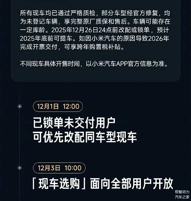 为确保有序推进,小米汽车设置了梯度开放节奏:12月1日12时起,已锁单但尚未提车的用户获得专属优先改配权;12月3日10时,服务全面向所有消费者开放。小米汽车特别承诺,在2025年12月26日24时前锁单的用户,预计可在年底前提车。若因小米汽车原因导致2026年交付,用户可享受跨年购置税补贴。