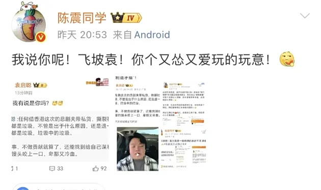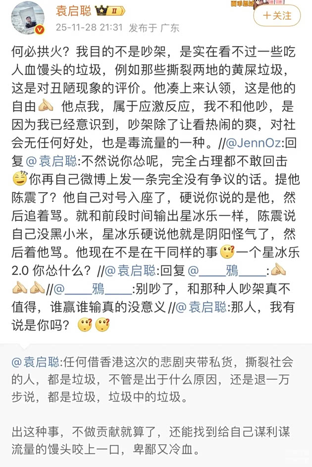 整件事的起因,是陈震在一条企业慈善捐款的新闻下,发表了一条被广泛解读为‘阴阳怪气’的评论。这引发了很多网友的反感,认为他是在消费灾难、蹭流量。袁启聪随后下场暗讽,两人从论战迅速升级为互相揭短、人身攻击。追溯源头,两人其实在早前就有过摩擦。