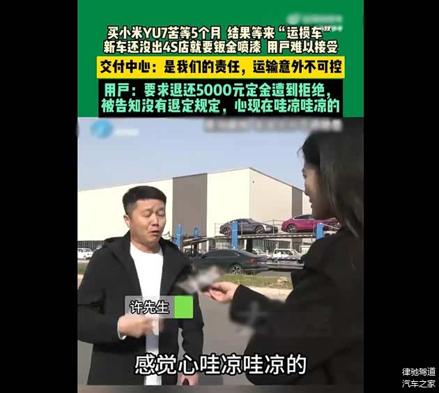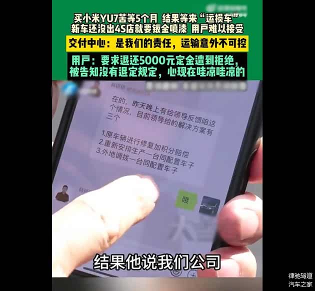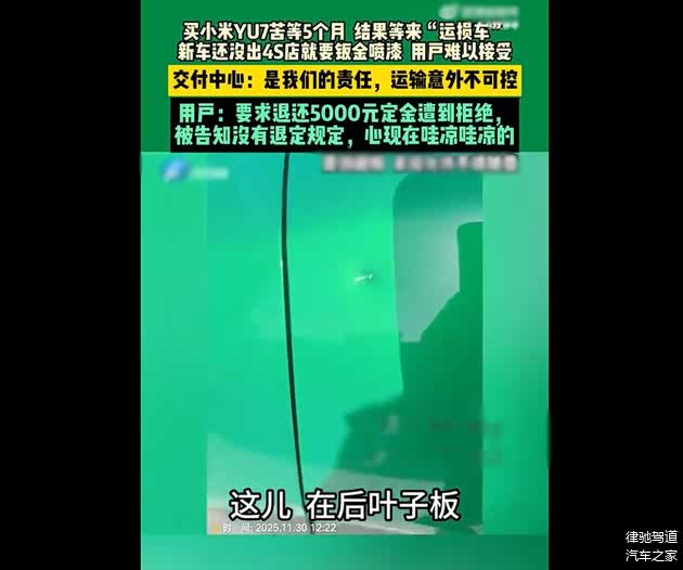 12月1日,郑州的许先生向媒体求助,称自己预订的 小米YU7汽车在苦等五个月后,到手的竟是一辆运损车。车身出现明显凹坑,让许先生无法接受。面对镜头,许先生说,“新车还没开出4S店,让我钣金喷漆,我苦苦等了5个月的车,告诉我有个凹陷。”