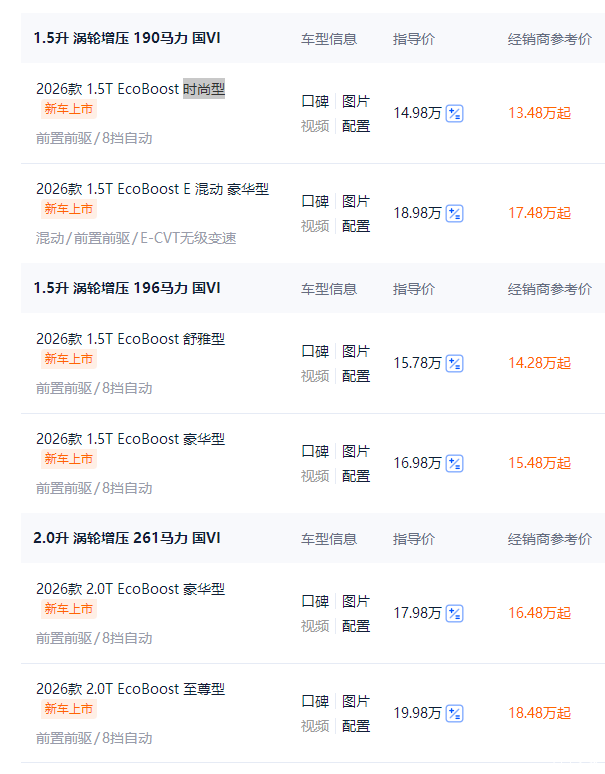 综合来看,此次中期改款通过动力矩阵扩容、智能配置优化、设计细节调整,进一步贴合了家庭用户与年轻消费者的需求,在15万-20万元合资B级车市场保持了一定的竞争力。从配置性价比来看,1.5T EcoBoost豪华型和2.0T EcoBoost豪华型分别是燃油版中的均衡之选和性能之选,能较好满足多数用户的核心需求。
