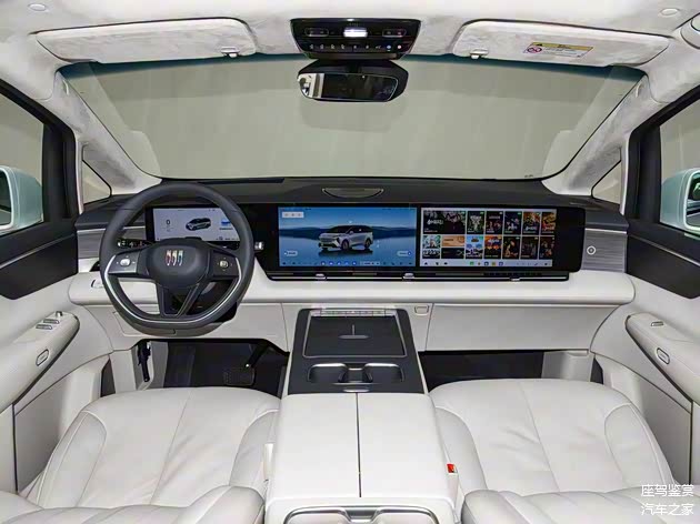 座舱内配备10.25英寸仪表屏、16.3英寸中控屏、16.3英寸副驾屏组成的三联屏,同时搭配HUD抬头显示系统及21英寸4K后舱娱乐屏,二排还设有两个5.5英寸控制屏,形成多屏交互格局。