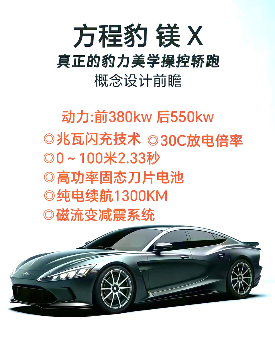 方程豹的轿车产品曝光,可能命名为镁系列,有网友建议首款车型命名镁X,并绘制出第一款轿车的概念图,采用四门轿跑设计,有大溜背还有大尾翼,核心配置方面,前电机最大功率380千瓦,后电机最大功率550千瓦,支持兆瓦闪充技术以及30C放电倍率,百公里加速2.33秒。配备比亚迪自研固态电池,纯电续航1300公里。