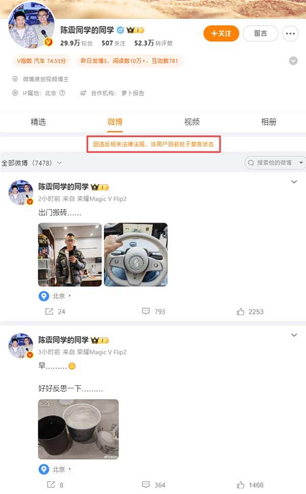 公开信息显示,陈震账号被禁前仍在持续更新,其微博账号12月4日晚间近23时仍有内容发布,短短数小时后便被全面限制访问,这种步调一致的操作在自媒体行业引发广泛关注。