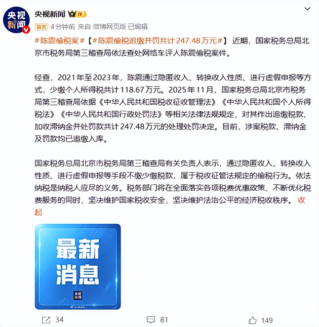 就在全网对禁言原因众说纷纭之际,12月5日中午,央视新闻报道了知名汽车博主“陈震”偷税一案。