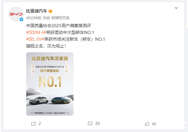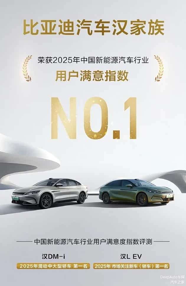 今日,比亚迪官方宣布,其汉家族在中国质量协会2025年新能源汽车行业用户满意度指数(NEV-CACSI)测评中再创佳绩: