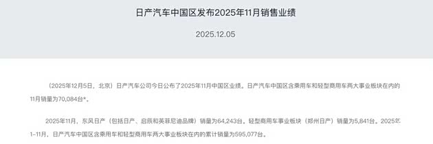 2025年11月日产汽车中国区含乘用车和轻型商用车两大事业板块在内的销量为70,084台,同比增长10.2%,其中东风日产(包括日产、启辰和英菲尼迪品牌)销量为64,243台,同比增长7.9%,郑州日产销量为5,841台,同比增长44.3%。截至11月底,日产汽车中国区含乘用车和轻型商用车两大事业板块在内的累计销量为595,077台,同比下滑4.3%。