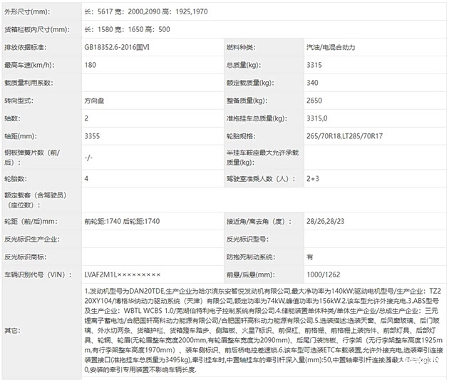 在申报信息当中,火星9 PHEV最引人瞩目的,莫过于其颠覆性的动力与油耗表现。根据工信部公示数据,新车搭载“2.0L汽油发动机+驱动电机”的插混系统,核心参数相较火星9传统轻混版实现全面跃升。发动机采用哈尔滨东安智悦发动机有限公司的DAN20TDE型号,排量1999ml,最大净功率140kW。