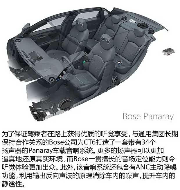 对于一款定位为品牌旗舰的豪华车来说,顶级的音响是必不可少的。长期以来,通用集团一直与美国知名音响大厂Bose保持着紧密的合作关系,而Bose也为别克和凯迪拉克品牌的多款车型定制了效果出众的车载音响系统。因此,CT6的音响系统当然依旧由Bose操刀,其搭载的Bose Panaray音响系统也是整个品牌车型中规格最高的原厂车载音响。