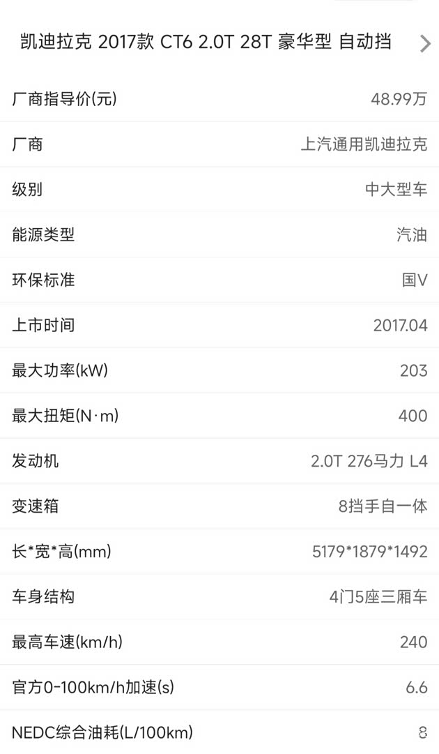 年款配置:凯迪拉克2017款CT6 28T豪华型