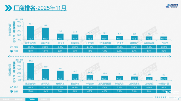 根据乘联会刚刚发布的数据,11月全国乘用车市场零售222.5万辆,同比下降8.1%,环比下降1.1%。今年以来累计零售2,148.3万辆,同比增长6.1%,为2月份以来首次双双出现下滑;汽车厂商排名方面,比亚迪稳住了,与吉利的差距没有扩大,值得一提的是首次把华为旗下的鸿蒙智行单独作为汽车厂商列入排行榜并直接“杀进”前十。