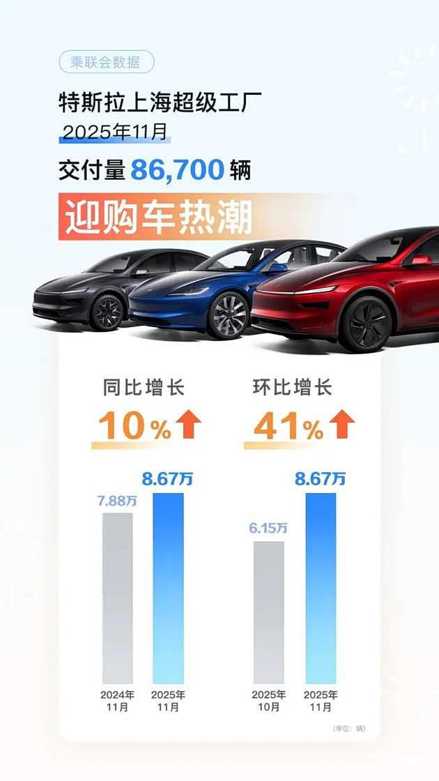中国乘用车联合会12月2日公布的最新数据显示,11月特斯拉上海超级工厂共交付Model 3和Model Y 86,700辆,同比增长10%,较10月环比增长40%。