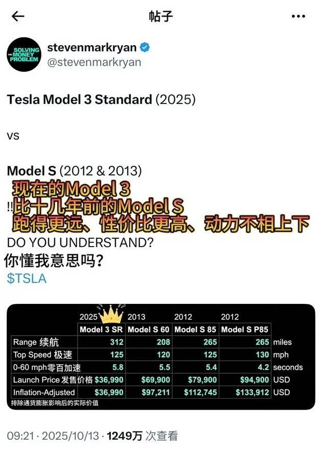 据一位海外博主整理,目前Model 3对比是10年前Model S的性能各方面都有所提升,价格却大幅降低。