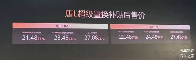 活动现场公布了极具吸引力的售价:汉L EV推出3款车型,超级置换补贴后售价为20.48万~26.48万元;汉L DM提供3款车型,超级置换补贴后售价为19.48万~24.48万元;唐L EV推出3款车型,超级置换补贴后售价为22.48万~27.48万元;唐L DM提供3款车型,超级置换补贴后售价为21.48万~27.08万元。