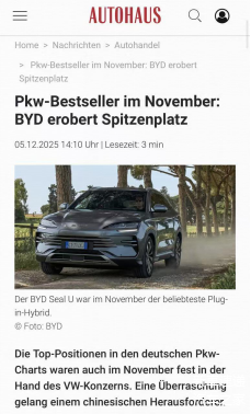 近日,BYD SEAL U(宋PLUS)成为德国11月车市插混车型销量冠军,引发行业广泛关注。这不仅是中国汽车品牌首次在德国主流细分市场登顶,更意味着比亚迪在欧洲的发展规模已进一步提升。