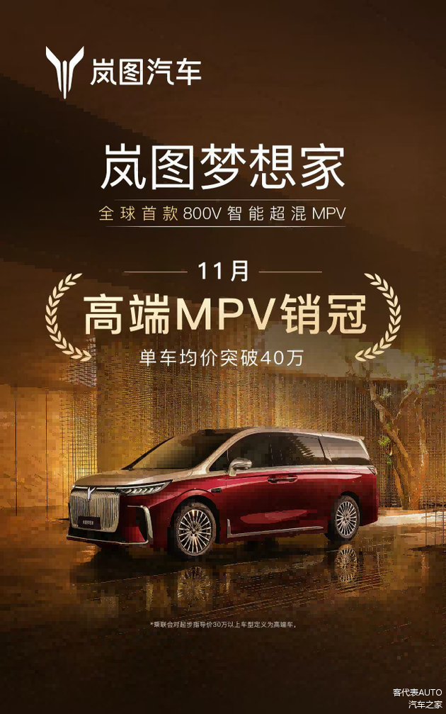 2025年11月高端MPV销量数据出炉, 岚图梦想家以9027台的成绩,再次蝉联高端MPV市场月销冠军。