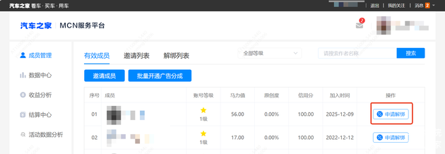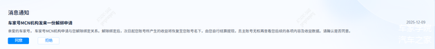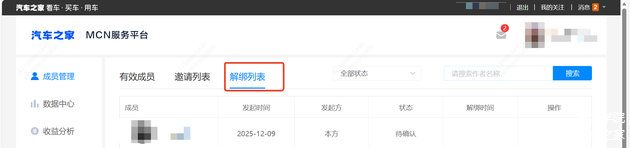 注:MCN机构或子账号发起解绑申请对方拒绝时,发起方可再次发起申请或提供有效的解绑声明、已到期的合同、取消授权声明书等能证明双方已取消授权绑定的证明文件至chejiahao@autohome.com.cn申请解绑。
