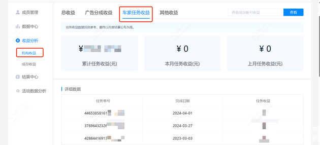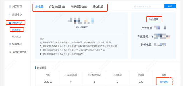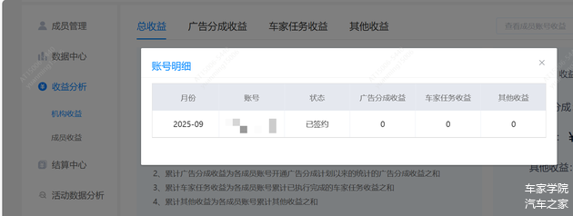MCN机构可查看所有子账号的全部收益,并在「详细数据」处可按月份查看流量分成、车家任务的各项总收益;