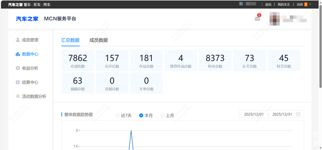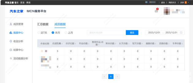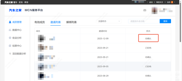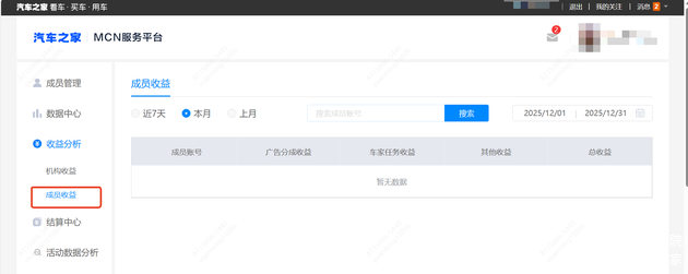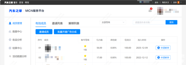 车家号MCN管理平台是车家号为MCN机构提供服务的平台,通过车家号MCN管理平台,MCN机构账号可邀请旗下子账号加入其MCN矩阵,并对旗下子账号进行统一的运营管理和结算提现,功能包括成员管理、数据中心、收益管理、结算中心。