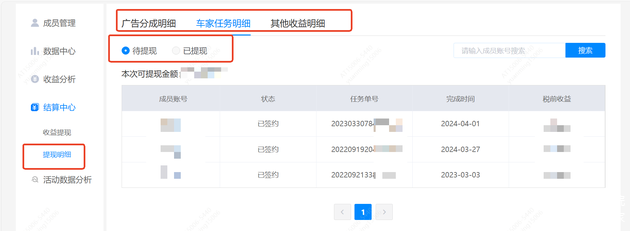 ④可在「结算中心」-「提现明细」分别查看流量分成、车家任务待提现和已提现的成员账号明细。