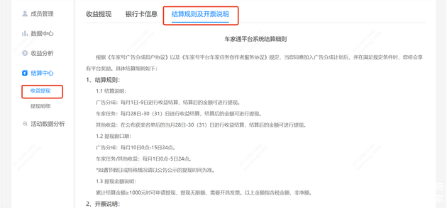 MCN机构可在「结算中心」-「收益提现」处查看流量分成收益和车家任务收益的待提现金额以及提现记录;