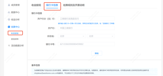 提现的MCN机构需在「结算中心」-「银行卡信息」处完善银行信息。注意,所提供的银行卡信息需与入驻时提供的营业执照保持一致。