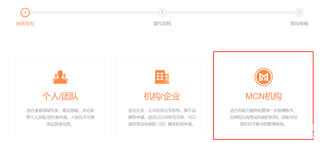 步骤2:注册成功后,继续申请车家号MCN机构账号,按步骤填写申请资料;(注:该账号仅用作对子账号管理使用)